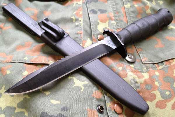 Нож немецкого спецназа представлен моделью “Bundeswehr Kampfmesser” с простой надежной конструкцией. Лезвие клинка имеет одностороннюю заточку и спуски, начинающиеся с его средины, металлическая гарда представлена одним нижним выступом, который загнут в сторону рукояти. Рукоять ножа выполнена из ударостойкого пластика и крепится к хвостовику двумя винтами, причем один из них имеет отверстие для продевания в него шнура или темляка.