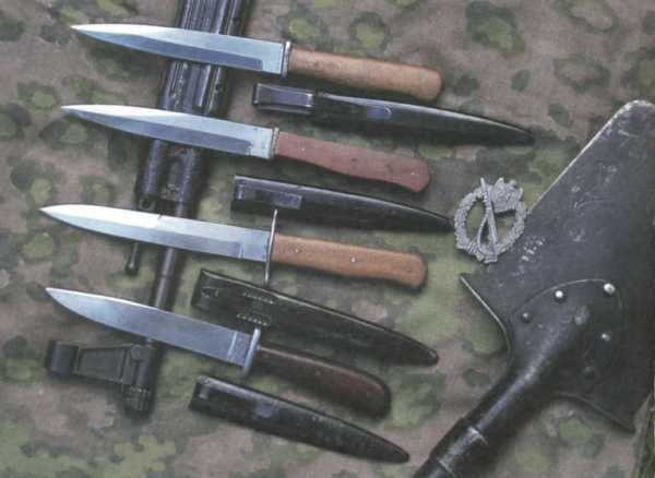 Π‘ΡΠ΅Π΄ΠΈ Π½Π΅ΠΌΠ΅ΡΠΊΠΈΡ Π½ΠΎΠΆΠ΅ΠΉ ΠΡΠΎΡΠΎΠΉ ΠΌΠΈΡΠΎΠ²ΠΎΠΉ Π²ΠΎΠΉΠ½Ρ ΡΠ»Π΅Π΄ΡΠ΅Ρ ΠΎΡΠΌΠ΅ΡΠΈΡΡ Π½ΠΎΠΆ Β«ΠΡΠΌΠ°Β», Π° ΡΠ°ΠΊΠΆΠ΅ Π½ΠΎΠΆ, ΡΠ΄Π΅Π»Π°Π½Π½ΡΠΉ Π΄Π»Ρ Π»Π΅ΡΡΠΈΠΊΠΎΠ² ΠΡΡΡΠ²Π°ΡΡΠ΅, ΠΊΠΎΡΠΎΡΡΠΉ ΡΠΈΠ»ΡΠ½ΠΎ Π½Π°ΠΏΠΎΠΌΠΈΠ½Π°Π» ΡΡΠ°Π½ΡΠ΅ΠΉΠ½ΡΠ΅ ΠΎΠ±ΡΠ°Π·ΡΡ Π²ΡΠ΅ΠΌΠ΅Π½ ΠΠ΅ΡΠ²ΠΎΠΉ ΠΌΠΈΡΠΎΠ²ΠΎΠΉ Π²ΠΎΠΉΠ½Ρ. ΠΡΠ΅ ΠΎΠ΄Π½ΠΈΠΌ ΠΏΡΠΈΠΌΠ΅ΡΠ°ΡΠ΅Π»ΡΠ½ΡΠΌ Π²ΠΈΠ΄ΠΎΠΌ ΡΡΠΎΠ³ΠΎ ΠΎΡΡΠΆΠΈΡ Π±ΡΠ» ΡΠΊΠ»Π°Π΄Π½ΠΎΠΉ Π½ΠΎΠΆ Π΄Π»Ρ ΠΏΠ°ΡΠ°ΡΡΡΠΈΡΡΠΎΠ², ΠΏΡΠΈΠ½ΡΡΡΠΉ Π½Π° Π²ΠΎΠΎΡΡΠΆΠ΅Π½ΠΈΠ΅ Π² 1937 Π³ΠΎΠ΄Ρ. ΠΠ³ΠΎ Π²ΡΠ΄Π°Π²Π°Π»ΠΈ Π»Π΅ΡΠ½ΠΎΠΌΡ ΡΠΎΡΡΠ°Π²Ρ ΠΈ Π΄Π΅ΡΠ°Π½ΡΠ½ΠΈΠΊΠ°ΠΌ. ΠΡΠΏΠΎΠ»ΡΠ·ΠΎΠ²Π°Π»ΠΈ Π΅Π³ΠΎ Π±ΠΎΠ»ΡΡΠ΅ Π² ΠΊΠ°ΡΠ΅ΡΡΠ²Π΅ ΠΈΠ½ΡΡΡΡΠΌΠ΅Π½ΡΠ°, ΠΏΡΠΈΠ½ΡΠΈΠΏ Π·Π°ΠΊΠ»ΡΡΠ°Π»ΡΡ Π² ΡΠΎΠΌ, ΡΡΠΎΠ±Ρ Π»Π΅ΡΡΠΈΠΊ, ΠΏΠΎΠ²ΠΈΡΡΠΈΠΉ Π½Π° ΠΏΠ°ΡΠ°ΡΡΡΠ΅ Π½Π° Π²Π΅ΡΠ²ΡΡ Π΄Π΅ΡΠ΅Π²Π°, ΠΌΠΎΠ³ Π΄ΠΎΡΡΠ°ΡΡ ΡΡΠΎΠΉ ΡΠΊΠ»Π°Π΄Π½ΠΎΠΉ Π½ΠΎΠΆ ΠΈ ΠΎΡΠΊΡΡΡΡ Π΅Π³ΠΎ ΠΎΠ΄Π½ΠΎΠΉ ΡΡΠΊΠΎΠΉ ΠΈ ΠΏΠ΅ΡΠ΅ΡΠ΅Π·Π°ΡΡ ΡΡΡΠΎΠΏΡ. ΠΠ³ΠΎ ΠΊΠΎΠ½ΡΡΡΡΠΊΡΠΈΡ ΡΠ°ΠΊ ΠΏΠΎΠ½ΡΠ°Π²ΠΈΠ»Π°ΡΡ Π°Π½Π³Π»ΠΈΡΠ°Π½Π°ΠΌ, ΡΡΠΎ ΠΎΠ½ΠΈ ΠΈΠ·Π³ΠΎΡΠΎΠ²ΠΈΠ»ΠΈ Π΅Π³ΠΎ ΠΏΡΠ°ΠΊΡΠΈΡΠ΅ΡΠΊΠΈ ΠΏΠΎΠ»Π½ΡΡ ΠΊΠΎΠΏΠΈΡ.