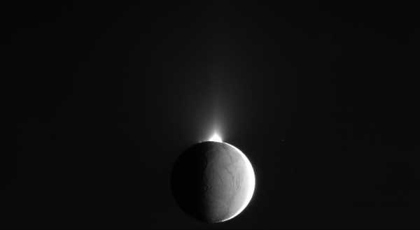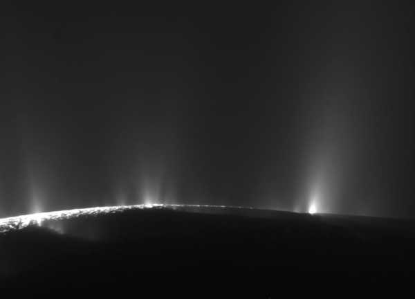 13. Энцелада извергает лед в космос. Снимок сделан 14 октября 2009 г. (NASA/JPL)