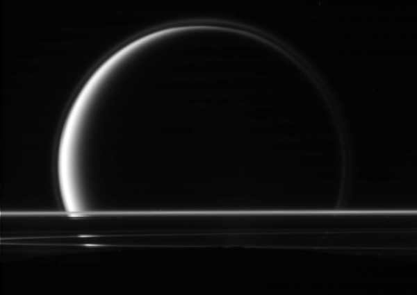 19. Спутник Энцелада за Сатурном и его кольцами. «Кассини» запечатлел этот снимок на темной стороне Сатурна. Свет, который проходит через атмосферу Сатурна, создает яркую дугу (сверху вниз). Внизу в центре свет, проходящий мимо, блокируется кольцами. 25 декабря 2009 г. (NASA/JPL)