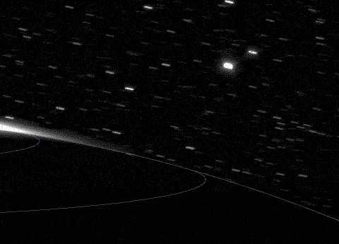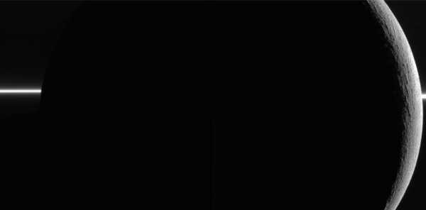 25. Энцелад частично блокирует «Кассини» вид на ярко освещенную часть колец Сатурна. 18 мая 2010 года. (NASA/JPL)