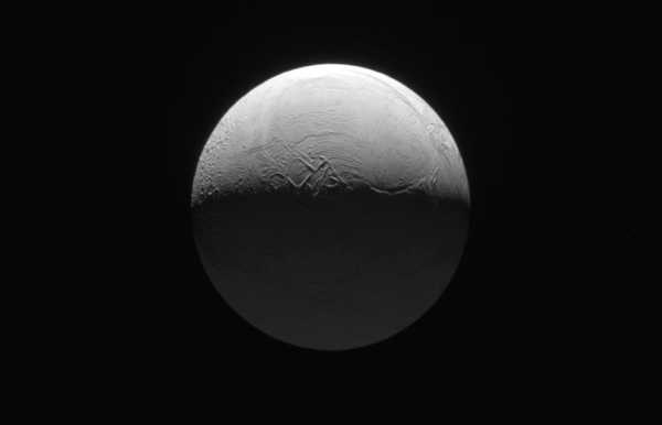 7. Спутник Сатурна Энцелад диаметром 500 км находится от «Кассини»на расстоянии примерно 200 000 км. (NASA/JPL)