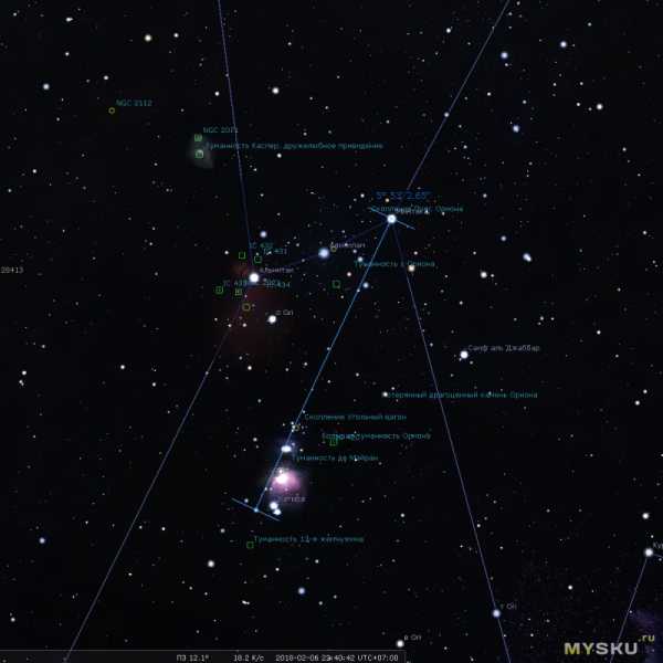 Способов прямого измерения поля зрения оптического прибора существует немало, я с ходу вспомнил целых четыре. Из них я выбрал самый простой: найти на небе две звезды, которые можно было бы расположить на противоположных границах поля зрения монокуляра, и посмотреть в Stellarium’е угловое расстояние между ними. Долго искать не пришлось: в качестве первой звезды хорошо подошла Минтака (крайняя правая звезда в «поясе Ориона»), второй стала ничем не примечательная звёздочка SAO135359, расположившаяся на острие «меча» того же самого Ориона. Как видно на представленном ниже скриншоте, угловое расстояние между этими звёздами составляет 5°53′, или 5.88°. То есть производитель немного занизил действительное поле зрения ради «круглости» цифр.