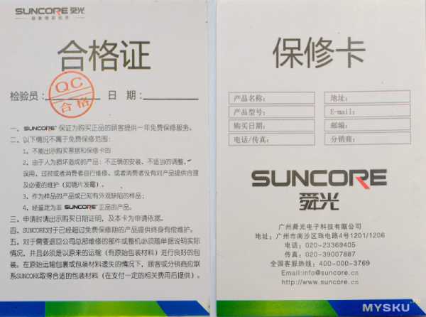 На одном из торцов коробки нанесена надпись «SUNCORE» (и продублирована иероглифами), под ней — круглая наклейка с текстом на китайском, ниже указана страна-производитель: «Made in China». На противоположном торце приведено полное наименование предприятия-изготовителя: GUAGNZHOU SUNCORE TECHNOLOGY CO. LTD (продублированное на китайском), некая длинная надпись, в которой я распознал адрес (однако прочесть его не могу, поскольку изучал японский, а не китайский), а ещё ниже — контактный телефон и адрес официального сайта Suncore: http://www.suncore.cn.