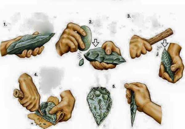 Применялись эти предметы и при собирательстве, и во время охоты, и для защиты от нападений хищников. Чуть позже первобытный человек изготавливает копье. Постепенно оно вытеснило палицу и дубинку. Вместе с рубилом появляются и становятся достаточно распространенными различные орудия, изготовленные из камня. Так, возникают скребки, отбойники, ножи, диски, остроконечники, наконечники для копий, резцы и прочее.Как изготавливались орудия труда первобытных людей