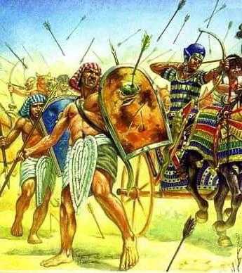 Следом за ними двигались лучники, стрелявшие через их головы и осыпавшие неприятеля тучами стрел. При этой тактике, применявшейся также и другими народами, всегда побеждала более дисциплинированная и обученная армия. В этом отношении египтяне не знали себе равных.