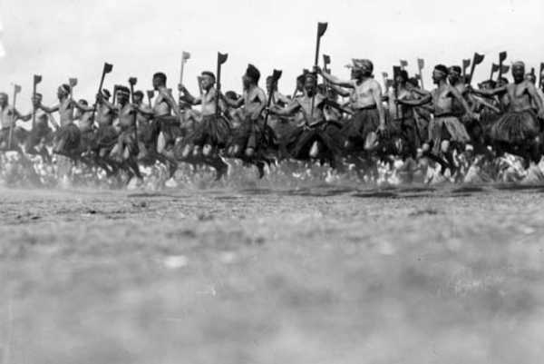 Воины племени Ngāti Tūwharetoa исполняют танец peruperu во время Дня Вайтанги 6 февраля 1934 года.