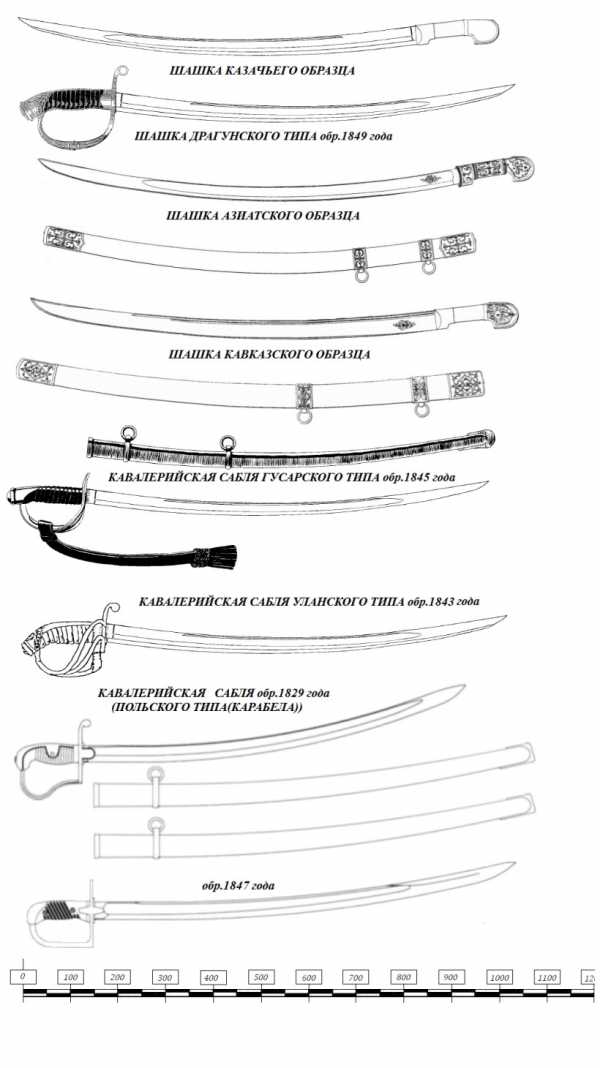 Сабли и шашки.Ими помимо кавалерии вооружались и все офицеры,а также фельдфебели подразделений(в современном виде-старшины)Их имелось огромное количество видов,особенно у казаков,где они передавались из поколения в поколение и у офицеров.Причём офицерские(не кавалерийские)полагались в мирное время только «для строя».На походе у офицеров(не кавалерийских) и у драгун шашки и сабли крепились по американскому образцу,т.е. у седла.Это облегчало действия драгун при спешивании(не болталась у ног) и всегда была под рукой в кавалерийском бою.
