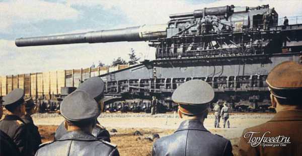 Первое место отдается самым огромным махинам — железнодорожным пушкам Густаву и Доре. Невероятно массивные громадины, калибром 800! миллиметров. Восемьдесят сантиметров Карл! Стреляла такая шайтан-труба четырехметровыми снарядами, со страшным весом. Дальность стрельбы составляла около 45 километров, и пробивались таким снарядом даже бетонные перекрытия семиметровой толщины, или тридцатиметровый пласт земли. Вот уж действительно царь-пушка. К счастью Густав пострелять так и не смог, а вот Дора таки поучаствовала в войне. Всего из нее было сделано 42 выстрела… Пожалуй это все же было напрасной тратой ресурсов и времени — пушка передвигаться могла только по специально проложенной железной дороге, перевозилась по частям а для сборки и настройки требовала расчет аж из четырех тысяч человек. Дорогое удовольствие. Очень.