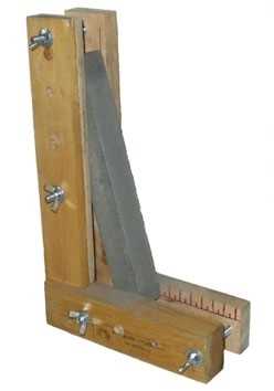 Простым приспособлением для затачивания ножей является инструмент, состоящий из пары деревянных реек и пары брусков с абразивом, с одинаковыми геометрическими размерами.