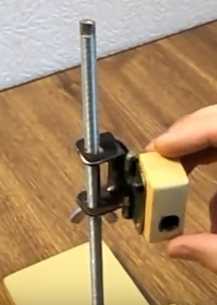 После того, как брусок и основание будут надёжно скреплены, предстоит вставить шпильку М8 в отверстие в бруске. Шпилька должна проходить по всему сечению бруска и основания; таким образом риск изменения её положения сводится к минимуму. Шпильку у основания бруска нужно жёстко зафиксировать гайкой М8, слегка утопив её при закручивании в древесине бруска.