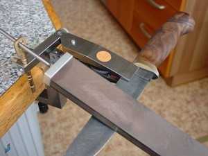 При обслуживании дорогих клинков следует использовать дополнительные аксессуары. Отличным приобретение станет держатель угла, который позволяет строго соблюдать необходимый угол.