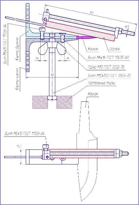 В металлических уголках следует выполнить отверстия и нарезать в них резьбу согласно чертежам. Затем сточить скосы на губках, которыми определена фиксация лезвия ножа, чтобы предупредить появление помехи движению точильного камня. Все острые углы и края будущего приспособления для заточки необходимо обработать напильником.