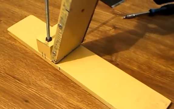 Далее в получившемся отверстии требуется нарезать резьбу под шпильку М8. Подготовленную таким образом деревянную плашку, необходимо прикрутить к основанию на расстоянии 265 мм от края при помощи обычных саморезов длиной 50 мм, вкрученных с обратной стороны основания.