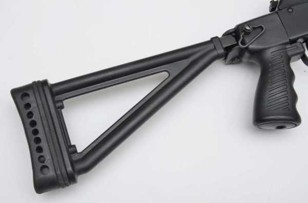 Также имеется пистолетная рукоять, позволяющая с относительным комфортом вести огонь со сложенным прикладом, например, если приходится действовать в замкнутых помещениях.