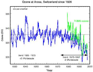 Динамика изменения озонового слоя над Аросой, ШвейцарияЭто неверно, уровень озона также падает во всей атмосфере. Это показывают результаты долговременных измерений концентрации озона в разных точках планеты. Вы можете посмотреть на график изменения концентрации озона над Аросой в Швейцарии справа.