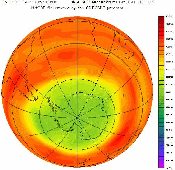 Антарктическая озоновая дыра в сентябре, с 1957 года по 2001.Озо́новая дыра́ — локальное падение концентрации озона в озоновом слое Земли. По общепринятой в научной среде теории, во второй половине XX века всё возрастающее воздействие антропогенного фактора в виде выделения хлор- и бромсодержащих фреонов привело к значительному утончению озонового слоя, см. например доклад Всемирной метеорологической организации:[1]