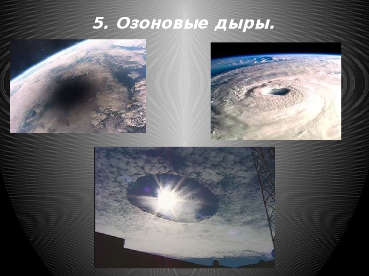 По результатам метеорологических исследований обнаружено, что нарушения озоносферы возникают не только в местах обитания человека, но и за их пределами: в Антарктиде и Арктике. Это оговорит о влиянии двух групп факторов появления озоновых дыр: