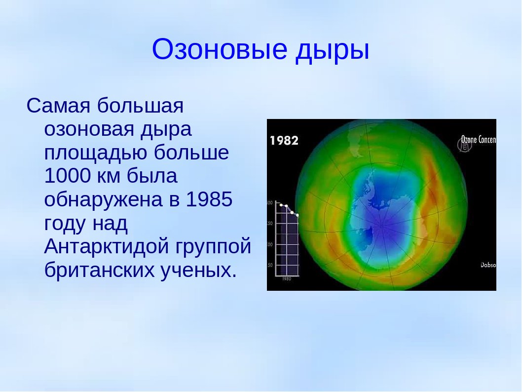 Что же, в таком случает, закономерным будет вопрос о расположении озоновых дыр. Первая озоновая дыра в истории была обнаружена в 1985 году над Антарктидой, по подсчетам ученых, диаметр этой озоновой дыры составлял 1000 км.