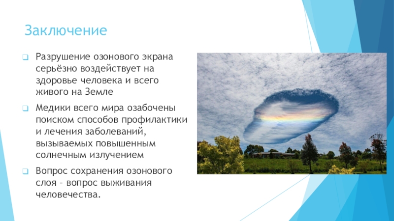 Сокращение там озонового слоя приводит к повышенной концентрации солнечных лучей и таянию ледников. Вместе с этим повышается средняя температура, а озоновый слой продолжает разрушаться.