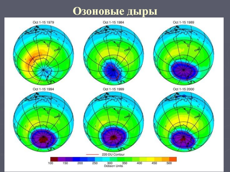 В 1985 г. было обнаружено, что в Южном полушарии вокруг Антарктиды с сентября по ноябрь образуется озоновая аномалия — Антарктическая озоновая дыра (АОД). По определению ВМО, озоновая дыра – это атмосферная область, в которой общее содержание озона (ОСО) меньше 220 е.