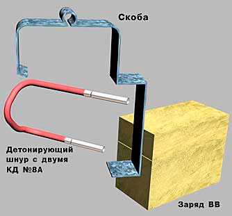 На рисунке слева показан вариант размещения мины с зарядом массой 1 кг. под рельсом. Замыкатель КЗ выведен на головку рельса и подсунут под бечевки, удерживающие мину в нужном положении