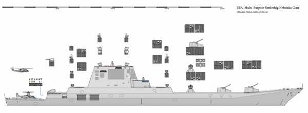 Ангар на 2 вертолета, один в варианте ПЛО, второй – ДРЛО. Вместо вертолетов могут быть использованы БПЛА.
