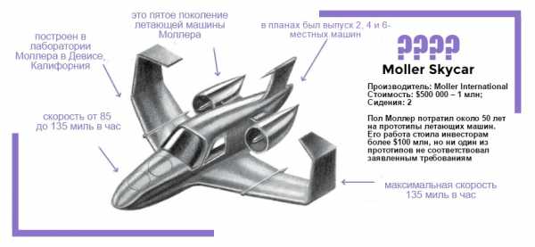 Первым создателем рабочего прототипа летающей машины является Пол Моллер, 79-летний профессор в Университете Девиса в Калифорнии. 50 лет назад он изучал авиационные двигатели и придумал концепт передвижного средства, которое можно припарковать в гараже, а когда нужно — доехать до ближайшей взлетной площадки и дальше полететь. Первый аппарат XM-2, который был похож на летающую тарелку с диваном в центре кабины, Моллер протестировал в 1966 году. Он сумел взлететь на высоту в полтора метра, а по бокам его придерживали аспиранты с привязанными к земле канатами. «Мы боялись, что машина может выйти из-под контроля и убить прохожих», – вспоминает Моллер.
