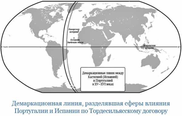 Возвращение Колумба с известием, что он открыл западный путь в Индию, естественно, обеспокоило португальцев: ставились под сомнение пожалованные Португалии в 1452 г. Римским Папой Николаем V права на все земли, открытые к югу и востоку от мыса Бохадор. Испанцы объявили открытые Колумбом земли своими и отказались признавать территориальные права Португалии. Разрешить этот спор мог лишь сам глава католической церкви. 3 мая 1493 г. папа Александр VI принял соломоново решение: все земли, которые португальцы открыли или откроют восточнее меридиана, проходящего в 100 лигах (одна лига равнялась примерно 3 милям или 4,828 км) к западу от островов Зеленого Мыса, принадлежат им, а территории западнее этой линии — испанцам. Год спустя Испания и Португалия подписали так называемый Тордесильясский договор, в основу которого легло именно это решение.