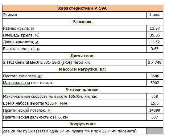 Как и следовало ожидать, новая силовая установка самолета с самого начала преподнесла ряд проблем. Реактивные двигатели обладали слишком низкой удельной тягой, лопатки турбин часто не выдерживали высоких температур, и их разрушение вело к катастрофическим для летательного аппарата последствиям. Максимальная скорость на высоте 7625 м составляла всего 646 км/ч — гораздо меньше, чем ожидалось и даже ниже чем у некоторых поршневых самолетов. Сама установка двигателей в корне крыла привела к проблемам с курсовой устойчивостью, из-за чего прицельная стрельба из пушек была практически невозможной. Тем не менее, работы по Р-59 продолжались, в первую очередь для выявления всех возможных проблем при освоении новой техники.