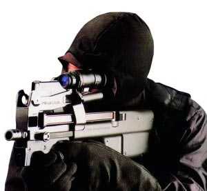 Наряду с совершенствованием классических конструкций пистолетов-пулеметов, проблему дальнейшего развития этого оружия на Западе попытались решить и иным путем. В 1989 г. бельгийские оружейники создали качественно новый пистолет-пулемет FN P-90, который, по их мнению, должен был совершить революционный прорыв в оружейном деле. Новое оружие, созданное в соответствии с концепцией «Personal defence weapon” (PDW) — «оружие личной самообороны”, предназначалось для вооружения экипажей боевых машин и военнослужащих, не участвующих непосредственно в боевых действиях (связистов, водителей, расчетов тяжелого оружия, операторов РЛС и т.п.). Этот образец рассчитан на использование принципиально нового малоимпульсного патрона 5,7х28, который, будучи много меньше автоматного, обладал бы такой же мощностью. Начальная скорость пули, равная 850 м/с, имеет весьма высокую кинетическую энергию — более 540 Дж, что позволяет этому очень компактному и легкому оружию взять на себя решение практически все задач, стоящих перед пистолетами-пулеметами, особенно на близких дистанциях — до 300-400 м. Автоматика пистолета-пулемета работает по принципу отдачи свободного затвора. Особенность Р-90 — наличие 50-зарядного магазина, размещенного сверху параллельно стволу. Причем патроны в нем расположены под прямым углом к оси канала ствола, поэтому в подающем механизме имеется специальное поворотное устройство. Большая часть деталей (за исключением ствола, затвора и подвижных деталей автоматики) изготовлена из ударопрочной термостойкой пластмассы. Магазин сделан из прозрачной пластмассы для визуального контроля расходования патронов. Необычный вид Р-90 вызван не только особенностями его конструкции, но и требованиями эргономики. По отзывам специалистов, это оружие очень удобно для стрельбы не только с плеча, но и при инстинктивной стрельбе с бедра. Небольшая отдача, наличие дульного тормоза-компенсатора, хорошо отработанная эргономика самой конструкции, режим стрельбы одиночными выстрелами или фиксированными очередями по три выстрела в сочетании с высоким темпом стрельбы (900 выстр/мин) обеспечивают высокую точность. В настоящее время бельгийская фирма FN стремится продвинуть этот пистолет-пулемет на международный оружейный рынок, причем прежде всего в качестве оружия специальных операций. В этом варианте вместо пламегасителя крепится глушитель, а на заднем приливе ложи выполнено посадочное гнездо для крепления лазерного целеуказателя.