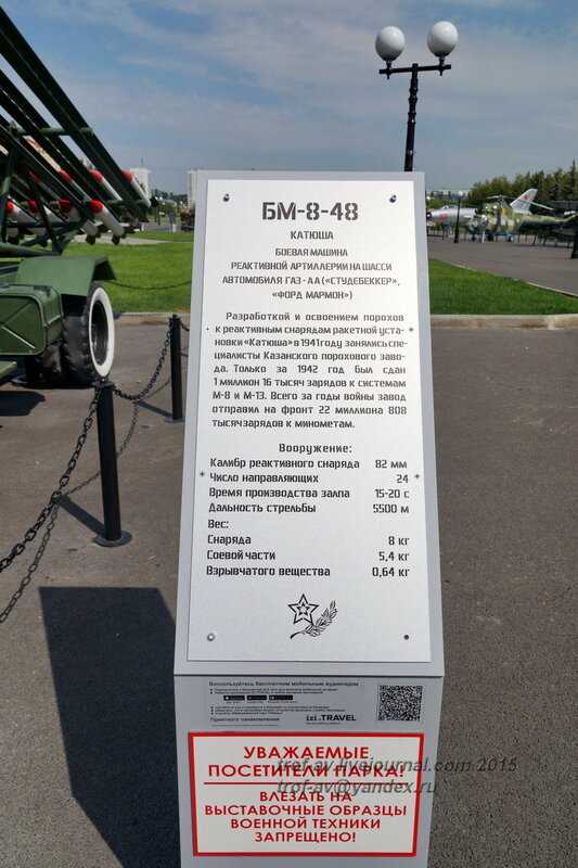 Парк Победы в городе Казань основан в 1970-е годы, тогда здесь высадили 1418 деревьев по числу дней Великой Отечественной войны. В 1995 году было завершено строительство мемориального комплекса. Сейчас парк Победы занимает около 50 гектар, здесь расположены пруд, мемориальный комплекс, памятники, выставка военной техники и детские площадки. В парке Победы можно увидеть: образцы бронетанковой техники — БМП-1, БТР-70, Т-34-85, ИСУ-152, Т-54-3, Т-62, Т-72, Т-80Б, БРДМ-2; артиллерию — ЗиС-3, БС-3, Д-1, М-30, ЗиС-2; вертолеты — Ми-2 и Ми-8; самолеты — МиГ-27К, Су-7Б, По-2, L-29, МиГ-17, Пе-2; и конечно «Катюшу» и полуторку, а также морские мины, рубку подводной лодки «Казань» и другую военную технику. На плакатах к технике много ошибок.Фото кликабельны, с географическими координатами и привязкой к яндекс-карте, 07.2015г.