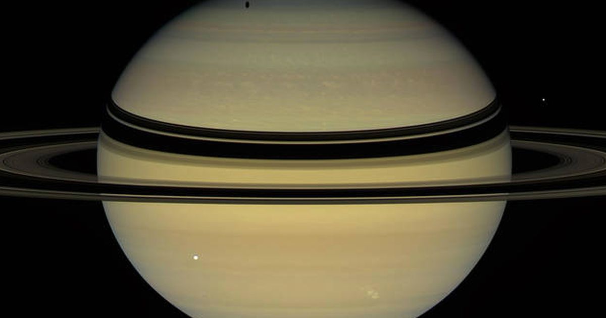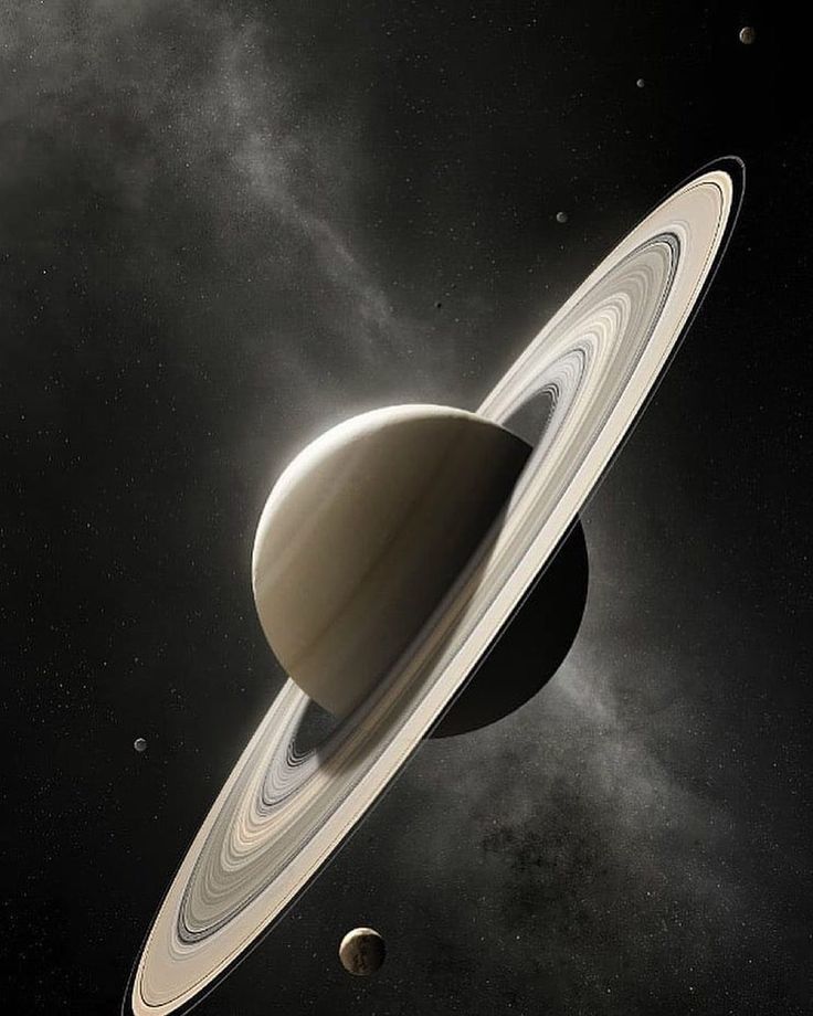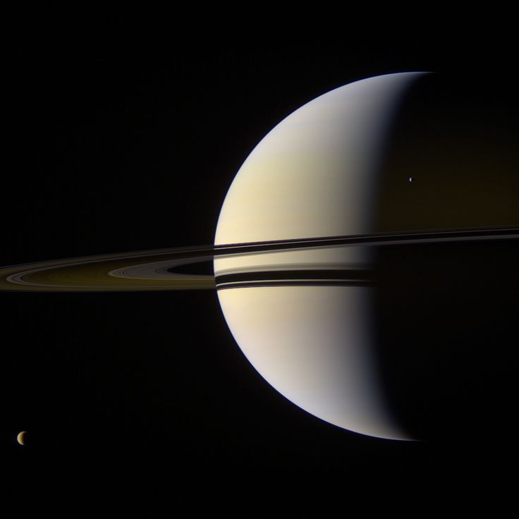 Вокруг планеты обращается 62 известных на данный момент спутника. Титан (на переднем плане) — самый крупный из них, а также второй по размерам спутник в Солнечной системе. За Титаном на фотографии расположен спутник Тетис.
