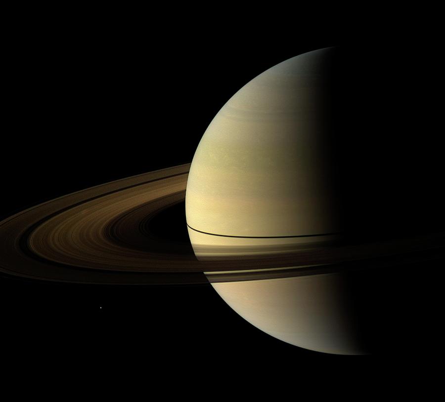 Фотография Сатурна с расстояния ~ 2.7 млн. км. Внизу слева видна белая точка. Это спутник Мимас. (Фото NASA | JPL | SSI):