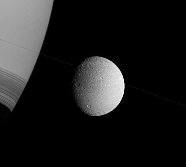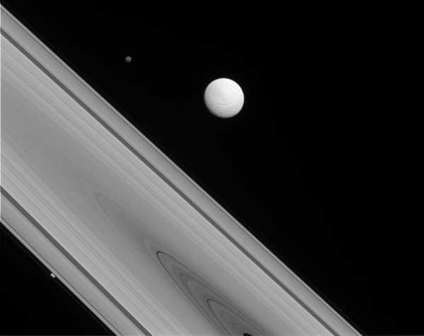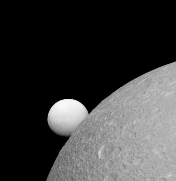 Два спутника Сатурна — Диона (рядом) и Энцелад (дальше). Диона состоит преимущественно из водяного льда со значительной примесью каменных пород во внутренних слоях.