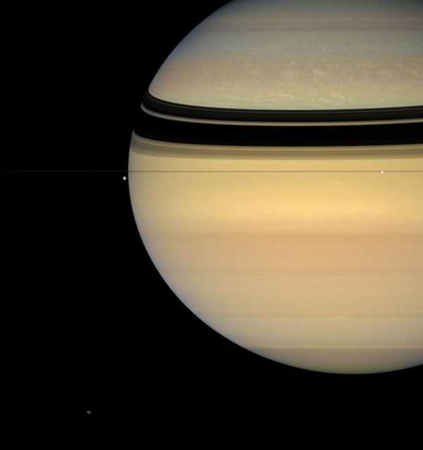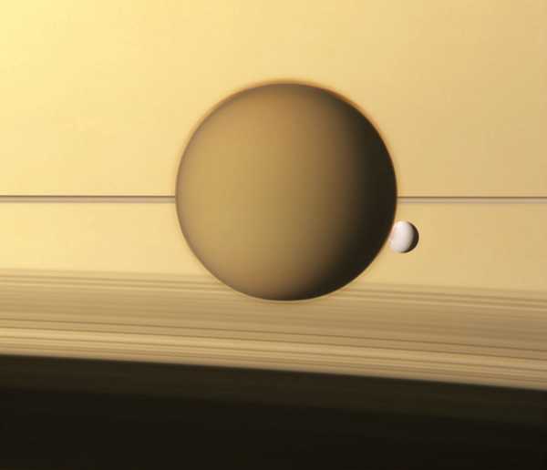 15. Кольца Сатурна «разрезают» Титан, который находится в тени меньшего спутника — Энцелада.