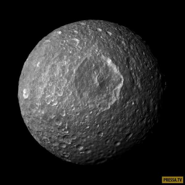 Спутник Мимас во всей красе. Имея размер около 400 километров, является двадцатым по величине спутником в Солнечной системе, а также самым маленьким известным космическим телом, которое имеет округлую форму из-за собственной гравитации.