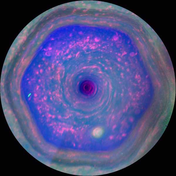 Гигантский шестиугольник на северном полюсе Сатурна, который мог бы вместить 4 Земли, до сих пор является для нас загадкой. Впервые он был обнаружен учеными в 1980-х годах. Каждая из сторон шестигранника имеет длину порядка 13 900 км, а период его вращения — 10 часов 39 минут