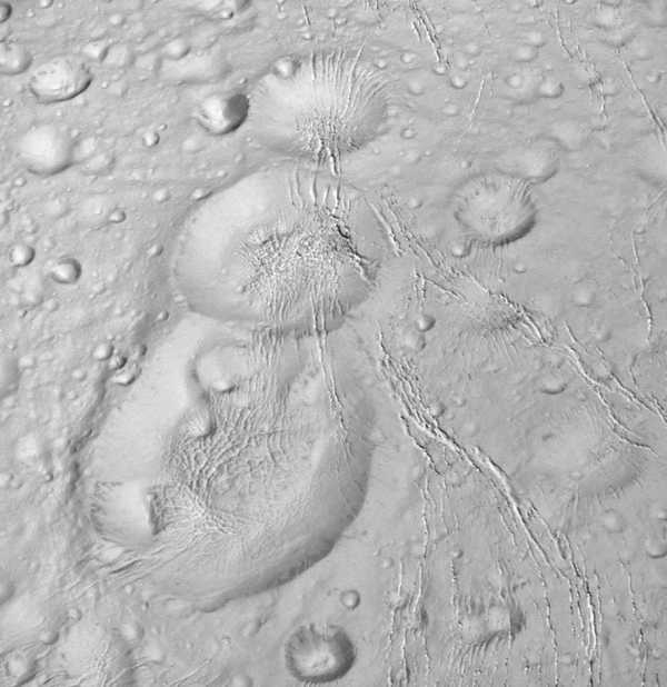 Станция Cassini нашла на спутнике Сатурна Энцеладе снеговик, который формируют три кратера. Снимки получены 14 октября 2015 года, когда аппарат находился на расстоянии 1839 километров от поверхности.