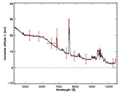 Черная линия означает спектр Земли, полученный во время наблюдения лунного затмения. Красные отметки это теоретический спектр будущего телескопа E-ELT при наблюдение транзитного аналога Земли в 10 парсеках от нас. Источник.