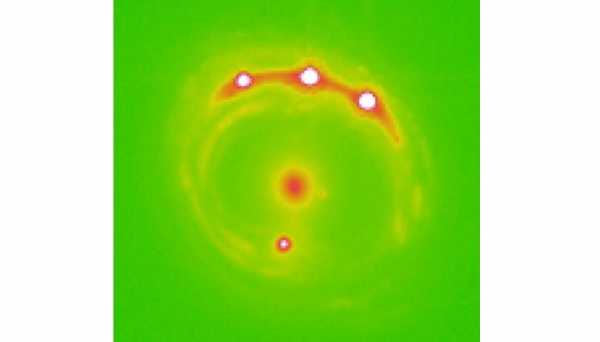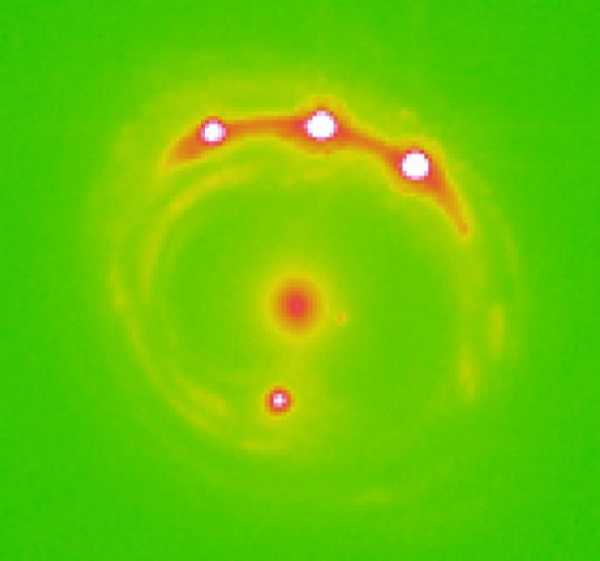 Изображение гравитационной линзы галактики RX J1131-1231 с линзовидной галактикой в центре и четырьмя изображениями квазара, находящимися на фоне. Исследователи предполагают, что на этом изображении в центре эллиптической галактики находятся триллионы планет