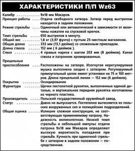 С пустым 25-местным магазином Wz63 весит всего 3,97 фунта (1,8 кг). Со сложенным прикладом его длина составляет 13,1 дюйма (333 мм). Ствол, длиной в 6 дюймов (152 мм) имеет 4 правосторонних нареза с шагом 8 дюймов (203 мм). Патронник и канал ствола хромированные.