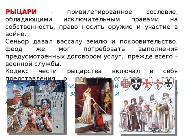 10. Почему сеньор обязательно должен был передать часть своих земель вассалам? 11. Почему ни один рыцарский турнир не мог состояться без герольдов? Чем ещё занимались герольды? С помощью ресурсов Интернета выясните и расскажите более подробно обо всех обязанностях герольдов в Средние века. 12. Кого называют рыцарем в наши дни? Расспросите об этом родителей и знакомых вашей семьи. Подумайте, в чём современный смысл этого слова совпадает со средневековым, а в чём нет. 13. Подумайте, какие правила поведения, предписываемые кодексом рыцарской чести, и при каких обстоятельствах чаще всего не выполнялись в реальной жизни? Выскажите своё мнение. 14. Что такое куртуазность: 1) правила поведения рыцаря при дворе, 2) взаимоотношения между землевладельцем и зависимыми крестьянами, 3) главная обязанность вассала по отношению к своему сеньору? Выберите правильный ответ.