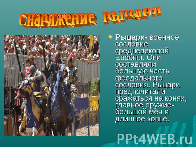 3. Война как образ жизни. Сеньоров и вассалов объединяло то, что все они были рыцарями. Слово «рыцарь» в русском языке происходит от немецкого «риттер» — всадник, конный воин. Считалось, что рыцарем может стать только человек знатный, и притом богатый, чтобы иметь боевого коня и вооружение.