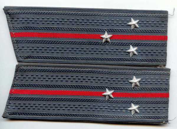 - расположение звезд на погонах следующее: две звезды располагаются по бокам центральной красной линии, как у лейтенанта, а третья звезда находится чуть выше и строго посередине просвета, как у младшего лейтенанта;