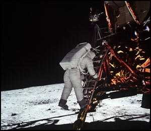 К Морю Спокойствия модуль подлетел в 20 часов 17 минут (по Гринвичу) 20 июля, но на поверхность Луны командир высадился лишь через пять часов (спустя какое-то время к нему присоединился и напарник). Исторический выход человека на Луну транслировала наружная камера с доставившего землян модуля. Эти кадры видели все: астронавты установили на спутнике флаг США (флаг ООН, как предлагало НАСА, Конгресс «забраковал») и вышли на связь с американским президентом.
