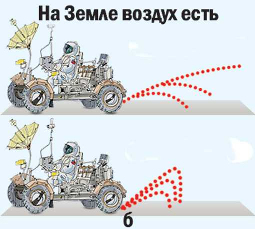 На Луне нет воздуха. Поэтому и камешки, и самые мелкие частицы, не встречая сопротивления, летят по симметричным траекториямК тому же непонятно, зачем им была нужна на Луне машина с мощностью электродвигателя всего в одну лошадиную силу. И сомнительно, чтобы в лунном модуле внезапно нашелся запас грузоподъемности в 325 килограммов, чтобы загрузить эту странную тележку.