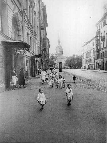 …Широкая магистраль, прорезая город, переходит в Московское шоссе, ведущее, к Фронту. Здесь создавался новый, центр Ленинграда. Стоят недостроенные корпуса высоких домов. Из величественного здания Ленинградского Дворца Советов фашисты сделали постоянную мишень. Сколько снарядов они выпустили по нему! Зияют пробитые в фасаде бреши. Придёт время, и дворец этот, как весь Ленинград, залечит свои раны.