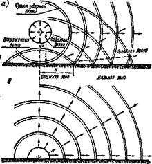 В дальней зоне на расстоянии, превышающем высоту взрыва, происходит сложение падающей и отраженной волны и образуется головная волна, давление в которой в 4—5 раз больше давления во фронте свободно распространяющейся сферической волны. Головная волна распространяется вдоль поверхности земли (рис. 16,а).