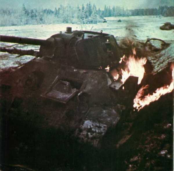 Горящий советский танк Т-34 подбитый в ходе боя в районе города Клин